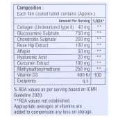 Collagen (Undenatured type II): 40 mg, Glucosamine Sulphate: 750 mg, Chondroitin Sulphate: 200 mG, Rose Hip Extract: 100 mg, Aflapin: 50 mg, Hyalulonic Acid: 20 mg, Curcumin Extract: 100 mg, Methylsulfonylmethane: 250 mg, Vitamin D3: 600 IU, Excipients q.s.