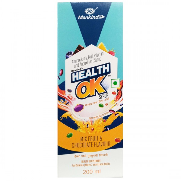 Health OK Mix Fruit & Chocolate Flavour Syrup is health supplement, enriched with Amino Acid, Multivitamin & Antioxidant. It helps to support in Growth & Development and also help to maintain Immunity.