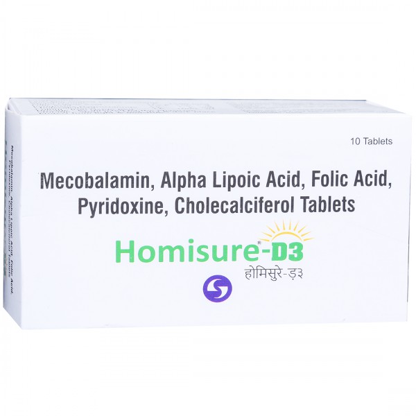 Homisure D3 Tablet is specially formulated for therapeutic use, particularly to support nerve health in individuals with diabetes. It contains a powerful combination of Mecobalamin, Alpha Lipoic Acid, Folic Acid, Pyridoxine, and Cholecalciferol, which work together to repair nerve damage, alleviate pain and tingling, reduce stress on nerves, and support strong bones.
