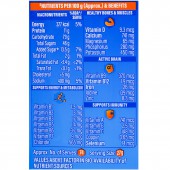 Energy: 377 kcal, Protein: 11 g, Carbohydrate 79 g, Total Sugars: 46 g, Added Sugar: 13.5 g, Total Fat: 2 g, Saturated Fat: <1.4 g, Trans Fat: <0.1 g, Cholesterol: <5 mg, Sodium: 400 mg, Vitamin D: 9.3 mcg, Calcium: 741 mg, Magnesium : 65 mg, Phosphorus: 280 mg, Potassium 450 mg, Vitamin B9: 370 mcg, Vitamin B12: 1.9 mcg, Iron: 26 mg, lodine: 139 mcg, Zinc: 8.3 mg, Vitamin A: 741 mcg, Vitamin E: 2.5 mg, Vitamin C: 148 mg, Copper: 0.65 mg, Selenium 74 mcg, Vitamin B1: 1.3 mg, Vitamin B2: 3 mg, Vitamin B3: 17 mg, Vitamin B5: 1.4 mg, Vitamin B6: 3.7 mg, Vitamin B7: 9 mcg, Chloride: 565 mg.