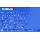 Malt (65.6%) [Barley (31.3%), Wheat Flour (Atta), Wheat, Millet], Milk Solids (14%), Sugar, Wheat Gluten, Minerals, Emulsifier (INS 471), Edible lodized Salt, Soy Protein Isolate, Acidity Regulators [INS 501(ii), INS 500(ii)], Vitamins.
