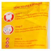 - Put on like baby pants, with "FRONT" word in front. To prevent leakage, leg guards must be fitted and not folded.