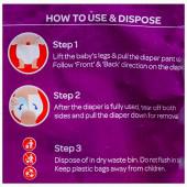 - Lift the baby's legs and pull the diaper pant up. Follow 'Front' and 'Back' direction on the diaper.