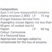 Alpha-Amylase (1:800): 75 mg (Fungal Diastase derived from Aspergillus oryzae digests not less than 60 g of cooked starch), Papain: 60 mg