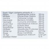 Neern Azadirachta Indica: 36mg, Mulethi Glycerrhiza Glabra: 36mg, Hand's Curcuma Longa: 36mg, Daruhald, Berberis Aristata: 36mg, Vanhaldi Curcuma aromatica: 36mg, Anant Mul Hemidesmus Indicus: 36mg, Bhnngraj Eclipta Alba: 36 mg, Nagiceshar Mesua ferrea: 36 mg, Dnataki Woodfordia Fruticosa: 36 mg, White ra Shorea Robusta: 227 mg, Rose Rosa Centifolia: 36 mg, Til Tail; Sesamum Indicum: 4.54 g, Distilled Water: Q.S.