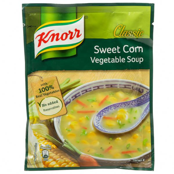 Knorr has hand-picked the best quality vegetables and mixed it with spices to make delicious Knorr Sweet Corn Vegetable Soup. A perfect blend of corn, carrots, cabbage gives it its lip-smacking taste and perfect consistency and is a perfect way to get your children to eat their vegetables. Made with 100% real vegetables and no added preservatives, this soup is ready in three simple steps. So now enjoy Restaurant like delicious Soup at home.Knorr Soups range comprises of 11 delicious flavours of 4 serve soups and 7 flavours of Cup-a-soup. Great taste is in our Nature! Knorr has gone to great lengths to ensure a perfect blend of ingredients and consistency that give you Restaurant like Soup at home.About Knorr:Just like you, we love everything about food, because no delicious meal is cooked without love. Love for carefully selected ingredients, flavours and spices, or the aroma of dinner wafting through your home. Love for the people you feed everyday; your family and friends, relatives and guests, the people that matter to you the most. With Knorr as your cooking partner, you can serve your loved ones nutritious and flavourful meals at home. Soup Fun Fact - The word 'soup' is of Sanskrit origin! It is derived from the su and po, which means good nutrition..