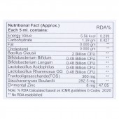 Energy Value: 5.56 kcal, Carbohydrate: 1.39 g, Fat: 0.000 g, Cholesterol: 0.000 g, Bacillus Clausii: 2 Billion CFU, Bifidobacterium Bifidum: 0.48 Billion CFU, Bifidobacteriurn Longum: 0.48 Billion CFU, Lactobacillus Acidophilus: 0.48 Billion CFU, Lactobacillus Rhamnosus GG: 0.48 Billion CFU, Fructooliposacchande(FOS): 300 mg, Saccharomyces Boulardii: 282.5 mg, Elemental Zinc: 8 mg