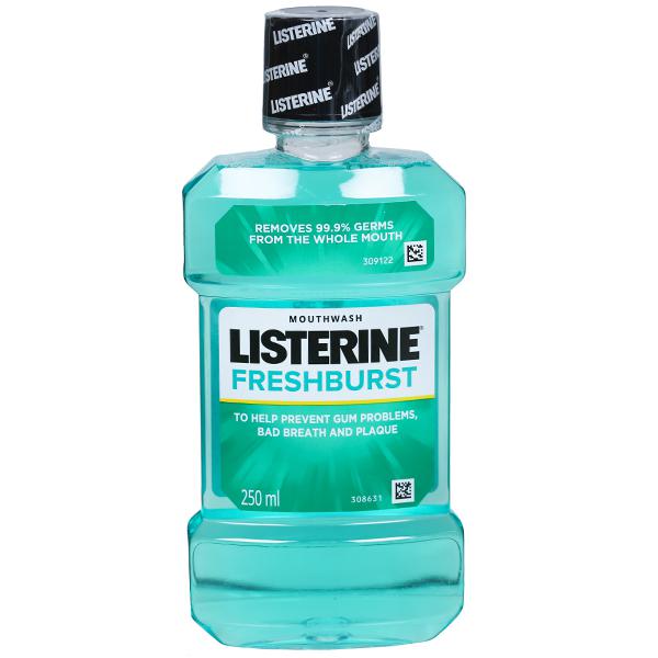 Product Information - Did you know? Brushing cleans only 25% of your mouth. Germs left behind in your mouth may cause bad breath, plaque and gum problems. LISTERINE® Fresh Burst Mouthwash reaches all parts of your mouth to remove 99.9% germs and reduce gum problems in 2 weeks. Our unique formula with 4 Essential Oils (Menthol, Thymol, Eucalpytol, Oil of Wintergreen) deeply penetrates to remove the bacteria in the plaque biofilm.