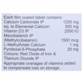 Calcium Carbonate (Eq. to Elemental Calcium): : 1250 mg ,Vitamin D3: 2000 IU , Mecobalamin (Methylcobalamin): 1500 mcg, L-Methylfolate Calcium: 1 mg, Pyridoxal-5-Phosphate: 20 mg.
