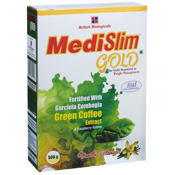Medi Slim Gold Vanilla Powder Refill helps manage weight and improve digestion and metabolism. With standardized green coffee extract, it provides up to 500mg of natural chlorogenic acid in the flavour of vanilla. It promotes metabolism and releases less glucose in the bloodstream resulting in weight management.