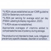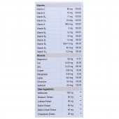 Vitamin C 65mg + Vitamin E 10mg, Vitamin B3 11mg + Vitamin D2 15mcg + Vitamin A 840mcg + Vitamin B: 5mg + Vitamin B2 1.9mg + Vitamin B6 1.9mg + Vitamin B1 1.4mg + Vitamin B9 129.41mcg + Vitamin B7 40mcg + Vitamin B12 2.2mcg + Magnesium 50mg + Iron 14.50mg + Zinc 13.20mg + Copper 0.85mg + Manganese 0.50mg + Iodine 140mcg + Chromium 50mcg + Selenium 40 mcg