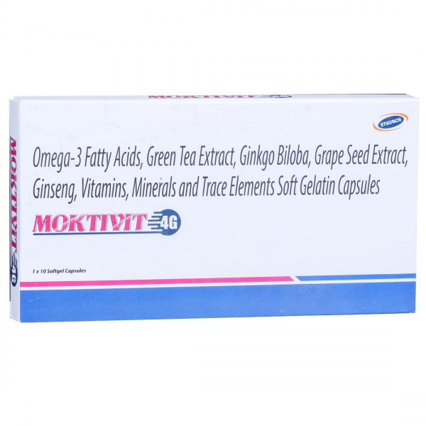 Moktivit 4G Capsule is advised to maintain the overall health scenario of an individual. It is formulated with Omega-3 Fatty Acids, Green Tea Extract, Ginkgo Biloba Extract, Grape Seed Extract, Ginseng, Vitamins, Minerals and Trace Elements. It helps to replenish the nutritional deficiencies and improve various conditions, such as cardiovascular health, hypercholesterolemia, immune function, cell metabolism, tissue repair, etc. It is also useful for eye & skin health, brain function and bone health.
