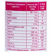 Energy : 98.7 kcal, Protein: 6 g, Carbohydrate: 18 g, (Sugar: 8 g), Fat: 0.3 g, Docosahexaenoic acid (DHA 10%): 100 mg, Calcium: 500 mg, Folic Acid: 250 mcg, Vitamin C: 40 mg, Iron: 35 mg, Vitamin D: 5 mcg, Vitamin B12: 1.2 mcg