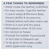 Inspect the water-filled teether before use. Water filled inside may become unsanitary due to certain climatic conditions & changes in temperature.