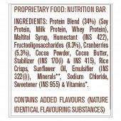 Protein Blend, Soy Protein, Milk Protein, Whey Protein, Maltitol Syrup, Humectant, Fructooligossaccharides, Cranberries, Cocoa powder, Rice Crisps, Sunflower Oil, Stabilisers, Emulsifiers, minerals, sodium chloride, sweetener, vitamins