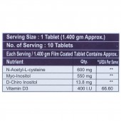 N-Acetyl L-cysteine, Myo-Inositol, Diluent [INS 460(i)], Disintegrant [INS 468 & 553(iii), Sodium Starch Glycolate, D-Chiro Inositol, Cholecalciferol, Binding Agent [INS 1201], Anti-Sticking Agent [INS 470 (iii)], Coating agent [INS 462 & INS 464], Anticaking Agent [INS 551], Preservatives [INS 216 & INS 218].