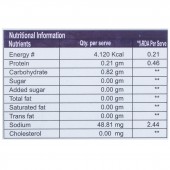 Energy: 4.120 Kcal, Protein: 0.21 g, Carbohydrate: 0.82 g, Sugar: 0.00 g, Added sugar: 0.00 g, Total fat: 0.00 g, Saturated fat: 0.00 g, Trans fat: 0.00 g, Sodium: 48.81 mg, Cholesterol: 0.00 mg