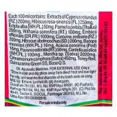 Extracts of Cyperus rotundus (RZ.): 200 mg, Hibiscus rosa-sinensis (FL): 250 mg, Eclipta alba (Wh. PL.): 50 mg, Parmelia perlata (Thallus): 200 mg, Withania somnifera (RT.): 100 mg, Emblica officinalis (DR.FR): 100 mg, Curcuma zedoaria (RZ.): 200 mg, Bacopa monnieri (Wh. PL.): 16 mg, Acacia concinna (Pod): 16 mg, Pavonia odorata (RT): 50 mg, Centella asiatica (Wh. PL.): 100 mg, Mentha sp. (Satva): 2020 mg, Cinnamomum camphora (Satva): 450 mg, Toney Red & Quinazarine Green SS, Base Q.S.
