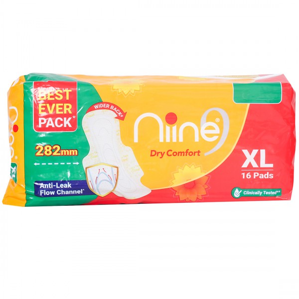 Niine Dry Comfort Sanitary Pad comes with 5 in 1 advanced benefits provide anti leak flow protection, ensuring a dry and comfortable experience. Crafted with an ultra-soft, double perforated top sheet, these pads fallow for quick absorption, keeping moisture away and allowing to feel fresh for up to 8 to 10 hours. Additionally a fresh fragrance that helps to lock in and eliminate bad odors, enhancing the comfort & control rashes. With longer and wider back coverage, these pads provide reliable dry protection, giving peace of mind and comfort throughout the day.