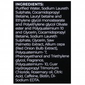 Purified Water, Sodium Laureth Sulphate, Cocamidopropyl Betaine, Lauryl betaine and Ethylene glycol monostearate and Polyethylene glycol Olivate ester and Polyquaternium 10 and Glycerin, Cocamidopropyl Betaine, Sodium Laureth Sulphate, Glycerin, Saw Palmetto Extract, Allium cepa ,(Red Onion Bulb Extract), Polyquaternium- 7, t phenoxyethanol and Triethylene r glycol, Fragrance, Polyquaternium- 10, Guar f'. f' Hydroxypropyl Trimonium Chloride, Rosemary oil, Citric cid, Caffeine, Biotin, Di-Sodium EDTA.