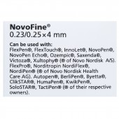 Novofine Pen Needle 32 G is a sterile, single-use 0.23/0.25 mm injection needle, which is intended for use with prefilled and durable drug delivery systems (pen injectors) for injection. Novofine needle is intended for subcutaneous delivery of other drug products such as solutions, suspensions and emulsions. It can be used with FlexPen, FlexTouch, InnoLet, NovoPen, NovoPen Echo, Ozempic, Saxenda, Victoza, Xultophy, FlexPro, Norditropin, NordiFlex, NordiPen, Autopen, BerliPen, Byetta, ClikSTAR, HumaPen, KwikPen, SoloSTAR, and TactiPen.