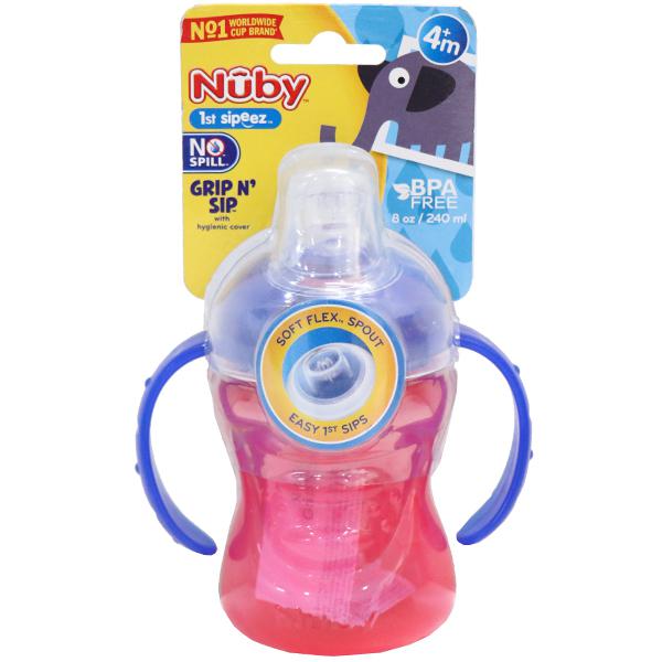 The Nuby Grip-n-sip Cups are perfect for transitioning from bottle to cup drinking. They feature easy-grip handles that are great for small hands and a soft silicone spout that is similar in feel to our silicone nipples. The silicone spout has a built-in valve that is easy to use, easy to clean and designed to reduce drips and spills.