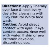 Cleanse your face with Olay Natural White Cleanser. Apply Olay Natural White to moisturize and care for your skin. Apply liberally to cleansed face and neck twice a day. Wash your face with a good cleanser before applying skin creams for better results