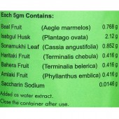 Beal Fruit (Aegle marmelos): 0.768 g, Isabgul Husk (Plantago ovata): 2.12 g, Sonamukhi Leaf (Cassia angustifolia): 0.852 g, Haritaki Fruit (Terminalis chebula): 0.416 g, Bahera Fruit (Terminalia belerica): 0.416 g, Amlaki Fruit (Phyllanthus emblica): 0.416 g, Saccharin Sodium: 0.0146 g