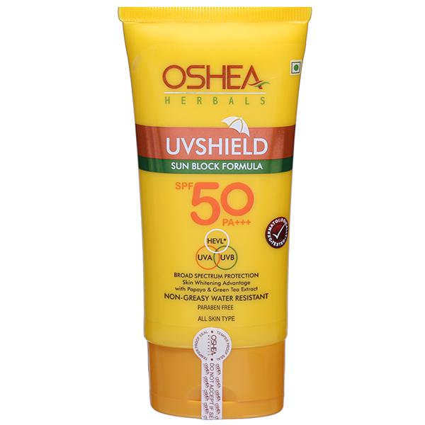 Oshea herbals UV shield SPF 50 sunblock cream is a complete broad-spectrum sun protection for all skin types. It is indicated to provide protection from ultraviolet HEVL, UVA & UVB rays to prevent sunburn, tanning, hyperpigmentation & premature ageing. It increases skin hydration. It is also a blend of natural herbal actives like papaya and green tea extract that deliver antioxidant benefits to help prevent free radical damage while nourishing and whitening skin.