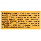 WATER, SODIUM PALM, KERNELATE, SORBITOL, GLYCERINE, SODIUM ROSINATE, SODIUM PALMATE, SODIUM STEARATE, PROPYLENE GLYCOL, SODIUM LAURYL SULFATE,PEG-4,ISOPROPYL ALCOHOL, PERFUME, SODIUM CHLORIDE, SODIUM METABISULFITE, TETRASODIUM ETIDRONATE, TETRASODIUM EDTA, BHT, CINNAMAL, EUGENOL, LIMONENE , LINALOOL CL 12490, CL47005.How to Use:-
