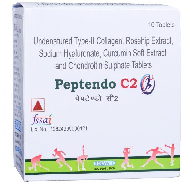 Peptendo C2 Tablet is a nutraceutical supplement, enriched with Undernatured Type-II Collagen, Rosehip Extract, Sodium Hyaluronate, Cucurmin Soft Extract and Chondroitin Sulphate.