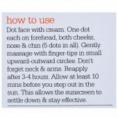 Dot face with cream. One dot each on the forehead, both cheeks, nose & chin (5 dots in all). Gently massage with fingertips in small upward-outward circles. Don't forget the neck & arms. Reapply after 3 - 4 hours. Allow at least 10 minutes before you step out in the sun. This allows the sunscreen to settle down & stay effective.