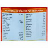 Maltodextrin, Malt Extract, Soya Protein Isolate, Milk Solids, Soya Fibre, Vegetable Oil, Corn Fat, Natural Cocoa Powder, Sucralose, Chocolate Flavour, Vitamins and Mineral Mix [Calcium Citrate and Dicalcium Phosphate, Sodium Chloride, Inositol, Ascorbic Acid, Niacinamide, Vitamin E, Zinc Sulphate, Riboflavin, Thiamine Mononitrate, Ferrous Fumarate, Pyridoxine Hydrochloride, Folic acid, D-Biotin, Sodium Selenite, Chromium Picolinate, Vitamin B12, Vitamin A & Ergocalciferol].