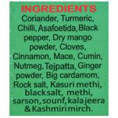 Coriander, Turmeric, Red Chilli, Asafoetida, Dry Mango Powder, Clove, Cinnamon, Mace, Cumin, Cassia, Nutmeg, Dry Ginger Powder, Black Cardamom, Black Salt, Tamarind, Tomato Powder, Green Chilli, KasuriMethi, Acidity Regulator (E296).