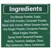 Coriander, Cloves, Cinnamon, Black Pepper, Mace, Red Chili, Dry Mango Powder, Dry Ginger, Amla, Tamarind Powder, Black Salt, Fennel, Anistar, Turmeric, Cardamom, Big Cardamom, Salt.