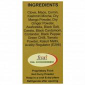 Clove, Mace, Cumin, Kashmiri Mircha, Dry Mango Powder, Dry Ginger Powder, Asafoetida, Black Salt, Cassia, Black Cardamom, Coriander, Black Pepper, Green Chili, Tomato Powder, KasuriMethi, Acidity Regulator (E296).