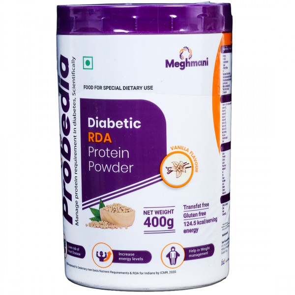 Probedia Diabetic RDA Vanilla Flavour Protein Powder is a dietary supplement, used to manage protein requirements in diabetes. It is enriched with low-fat, high-fiber ingredients and contains no added sugar. It is designed to help in weight management, increase energy levels, and lower the risk of heart disease.