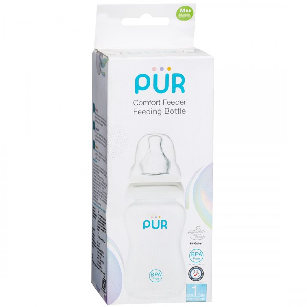 Pur Glass Feeding bottle has a Pro-flo unique Anti-Colic bottle system which reduces air swallow during feeding and helps to reduce tummy troubles. Pur Standard neck comfort nipples is made from extra soft silicone. The nipple is ergonomically designed to mimic a mothers breasts which soothes the baby while feeding. Pro-flo is a unique Anti-colic baby feeding bottle value system with in-built air chamber which enhances the drinking performance by initiating the air intake faster than similar products; therefore allowing a balance flow of liquid with the minimum suction effort. Bottle is made of quality food grade material and free from Bisphenol-A Chemical (BPA Free) which is safe for baby.