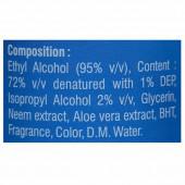 Alcohol Content:- Ethyl Alcohol (95% v/v), Content : 72% v/v denatured with 1% DEP. Isopropyl Alcohol 2% v/v