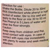 How to use – Shake the bottle, dilute 20 to 30 ml Rax Disinfectant white phenyle in half bucket of water. Stir to mix well and apply to the floor.