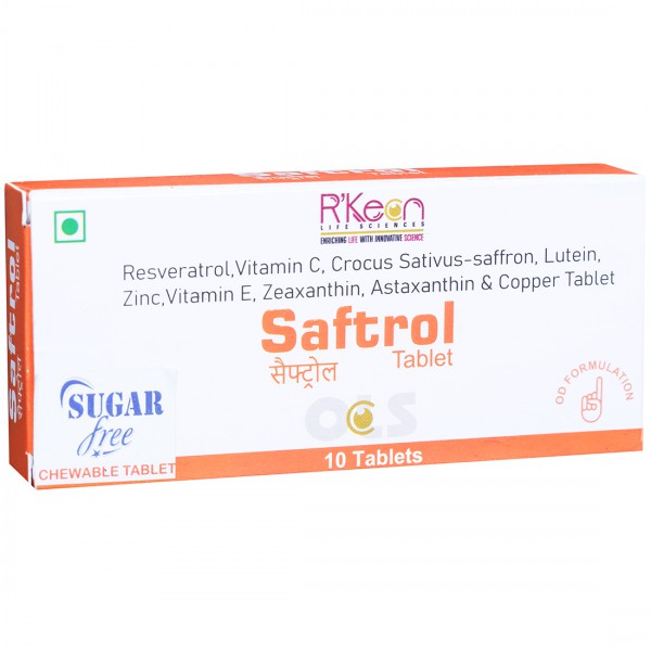 Saftrol Tablet is a nutraceutical supplement, which is sugar free and chewable. It is enriched with resveratrol, vitamin C, crocus sativus-saffron, lutein, zinc, vitamin E, zeaxanthin, astaxanthin and copper.