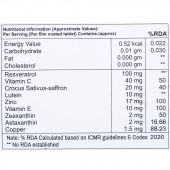 Energy Value: 0.52 kcal, Carbohydrate: 0.01 g, Fat: 0.000 g, Cholesterol: 0.000 g, Resveratrol: 100 mg, Vitamin C: 40 mg, Crocus Sativus-saffron: 20 mg, Lutein: 10 mg, Zinc: 17 mg, Vitamin E: 10 mg, Zeaxanthin: 2 mg, Astaxanthin: 2 mg, Copper: 1.5 mg.