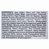 Aqua (Water), Stearic Acid, Cetyl Alcohol, Rosa centifolia Flower Water, Caprylic/Capric Triglyceride, Triethenolamine, Pearl Powder, PEG-100 Stearate, Glyceryl Stearate, Sucrose Dilaurate (and) Polysorbate-20, Pisum sativum (Pea) Extract, Caprylyl Glycol (and) Caprylhydroxamic Acid (and) Glycerin, Simmondsia (Jojoba) Seed Oil, Butyrospermum parkii Butter (Shea Butter), Daucus carota (Carrot) Seed Extract, Olea europaea (Olive) Fruit Oil, Tocopheryl Acetate, Niacinamide, Dimethicone, Parfum (Fragrance), Amyl Cinnamal, Benzyl Salicylate, Eugenol, Geraniol, Isoeugenol, Benzyl Benzoate, Linalool, Alpha-isomethyl Ionone, Butylphenyl Methylpropional, Tetrasodium EDTA, Sodium Sulfite, Pentaerythrityl Tetra-di-t-butyl Hydroxyhydrocinnamate, Caratonia Siliqua Gum, Citric Acid, Phenoxyethanol, Ethylhexylglycerin.