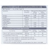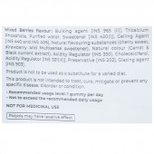 Mixed Berries Flavour: Bulking agent [INS 965 (ii)], Tricalcium Phosphate, Purified Water, Sweetener [INS 420 (i)], Gelling Agent [INS 440 and INS 406], Natural Flavouring Substances (Cherry Sweet, Strawberry and Multisense Sweetener), Natural Colour (Carrot & Black Current Extract), Acidity Regulator [INS 330], Cholecalciferol, Acidity Regulator [INS 331(iii)], Preservative [INS 202], Glazing Agent [INS 903].