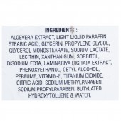 Aloe Vera Extract, Light Liquid Paraffin, Stearic Acid, Glycerin, Propylene Glycol, Glycerol Monostearate, Sodium Lactate, Lecithin, Xanthan Gum, Sorbitol, Disodium EDTA, Laminariya Digitata Extract, Phenoxyethanol, Cetyl Alcohol, Perfume, Vitamin-E, Titanium Dioxide, Citric Acid, Sodium Methylparaben, Sodium Propylparaben, Butylated Hydroxytoluene, Water.