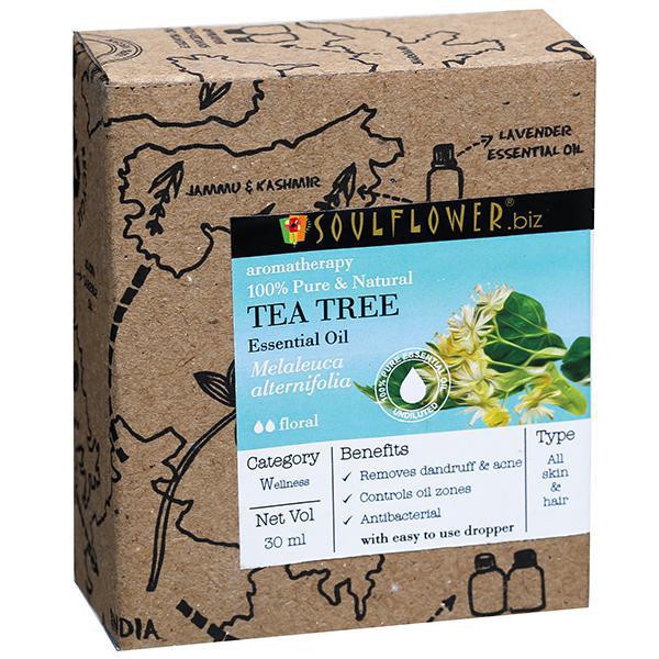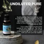 100% Pure, Natural and Vegan Soulflower Tea Tree Essential Oil controls acne and pimples, lightens blemishes, soothes skin. It also controls dandruff giving you lustrous hair.