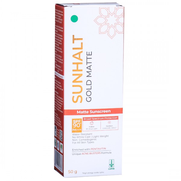 Sunhalt Gold Matte Spf 90 + Pa +++ Sunscreen is a dermatologically tested, non-comedogenic, lightweight, matte finish,oil-free sunscreen that leaves no white cast and non greasy formulation. It has unique blend of Acne Busters and Pentavitin formula that moisturizes and rejuvenate skin. It offers broad spectrum protection from UVA/UBV, IR, blue light & HEVL rays with SPF 900 +(PA+++). Additionally natural plant extracts eliminate harmful effect of reactive oxygen species & free radicles, protects skin from stresses and prevent inflammation. Effectively it promoting a more radiant, blemish-free, and even complexion, both indoors and outdoors.
