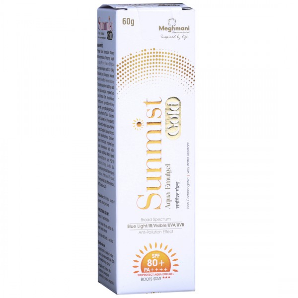 Sunmist Gold SPF 80+ Pa++++ Aqua Emulge features a cosmetically elegant, lightweight and non-greasy formula that is highly water-resistant and free from white cast residue. It has been dermatologically tested to ensure its effectiveness. It Offers broad-spectrum protection against Blue Light, Infrared, Visible light, UVA, and UVB rays which helps to prevent sunburn, skin tanning, premature aging, and various photo-damaged conditions. Enriched with Infraguard, a strong antioxidant component, this sunscreen guards the skin against pollution and free radicals induced by IR and Blue Light. It also prevents the loss of skin density caused by sun exposure and protects mitochondrial DNA. It provides essential 2-in-1 protection, suitable for outdoor activities as well as indoor use against digital screens, smartphones, computers, televisions, and LED lamps that emit high levels of blue light. It's an ideal choice for use under makeup, ensuring the skin stays protected and radiant.