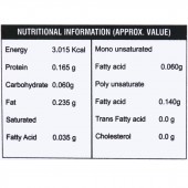 Energy: 3.015 kcal, Protein: 0.165 g, Carbohydrate: 0.060 g, Fat: 0.235 g, Saturated Fatty Acid: 0.035 g, Mono Unsaturated Fatty Acid: 0.060 g, Poly Unsaturated Fatty Acid: 0.140 g, Trans Fatty Acid: 0.0 g, Cholesterol: 0.0 g