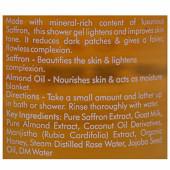 Pure Saffron Extract (Crocus Sativus Flower Extract), Goat Milk (Caprae Lac), Sweet Almond Essential Oil (Prunus Amygdalus Dulcis Oil), Coconut Oil Derivative ( Cocos Nucifera Oil), Manjistha Extract (Rubia Cordifolia), Organic Honey ( Mel Extract), Steam Distilled Rose Water ( Rosa Centifolia Flower Water), Jojoba Oil Derivative (Simmondsia Chinensis Seed Oil), DM Water (Aqua)